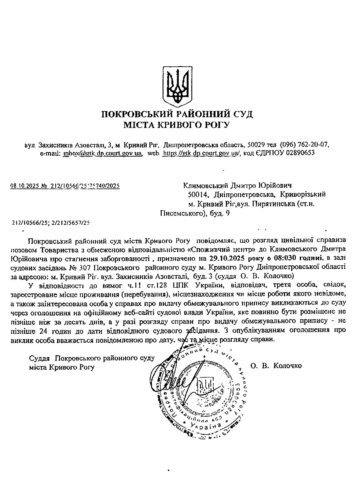 Оголошення про виклик до суду Климовського Дмитра Юрійовича
