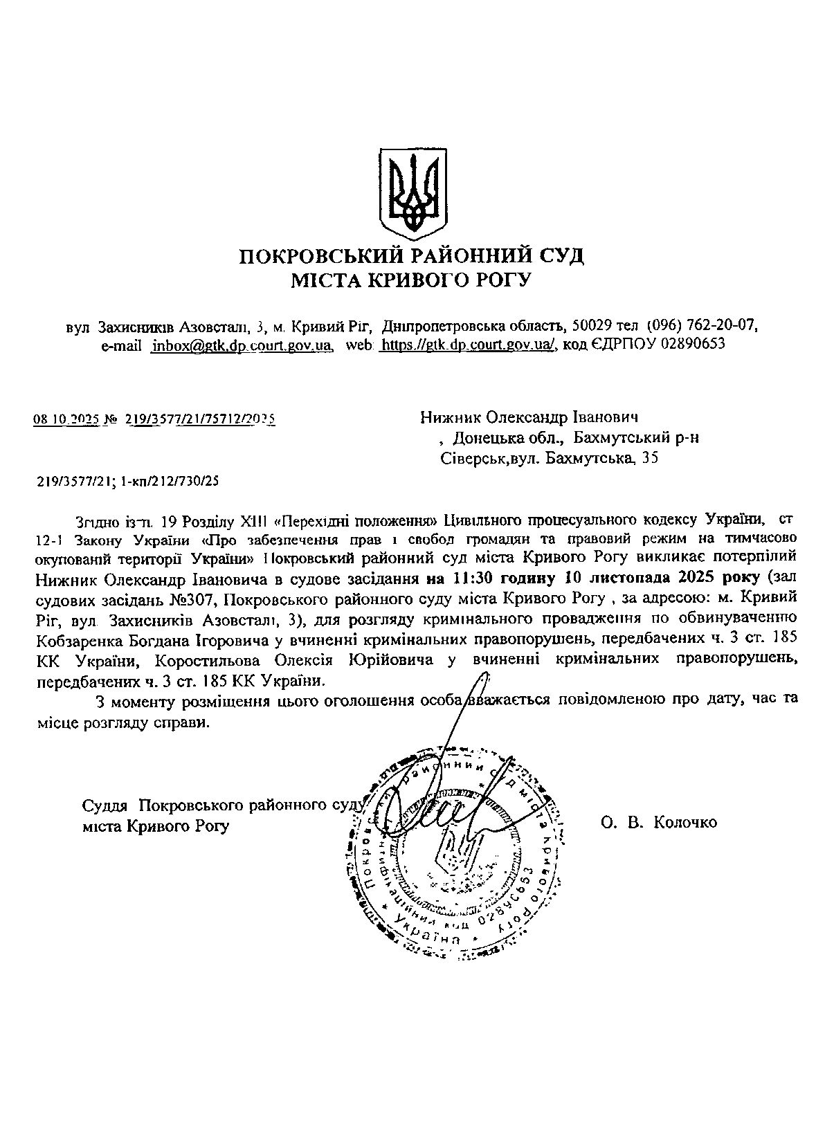 Оголошення про виклик до суду Нижника Олександра Івановича