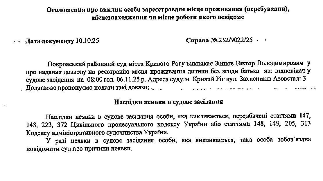 Оголошення про виклик до суду Зінцова Віктора Володимировича