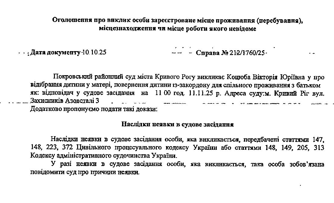 Оголошення про виклик до суду Коцюби Вікторії Юріївни