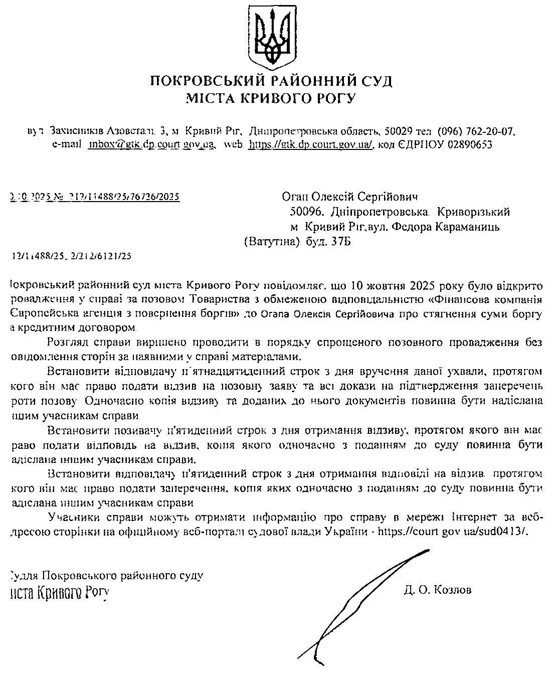 Оголошення про виклик до суду Огапа Олексія Сергійовича