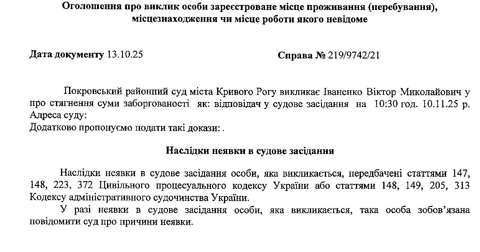 Оголошення про виклик до суду Іваненка Віктора Миколайовича