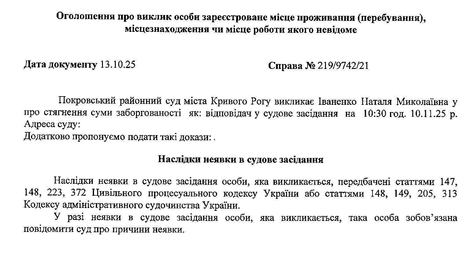 Оголошення про виклик до суду Іваненко Наталі Миколаївни