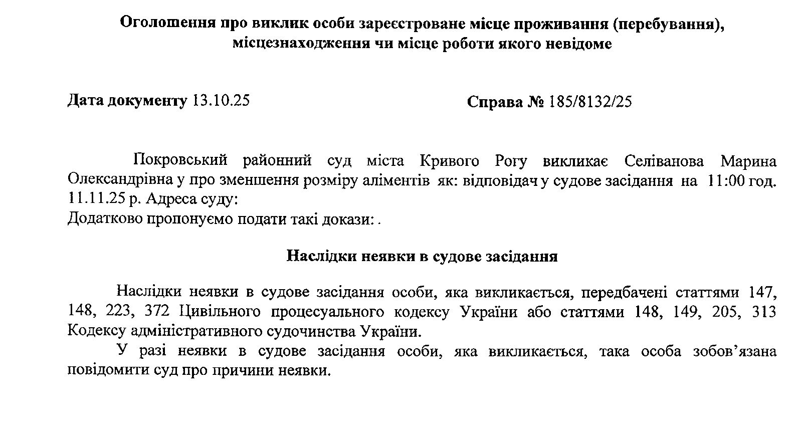 Оголошення про виклик до суду Селіванової Марини Олександрівни