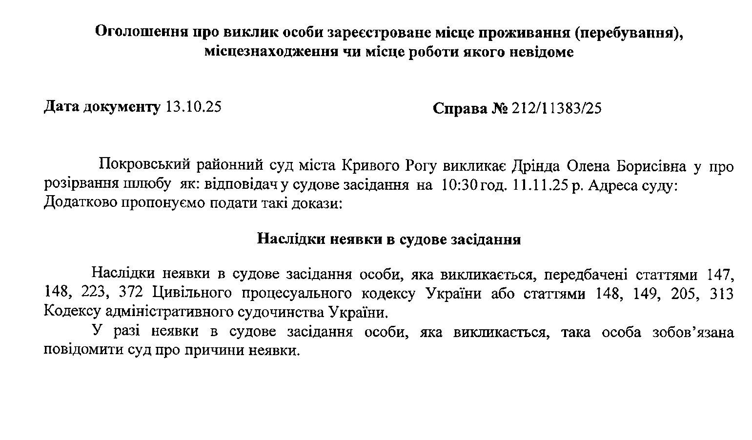 Оголошення про виклик до суду Дрінди Олени Борисівни