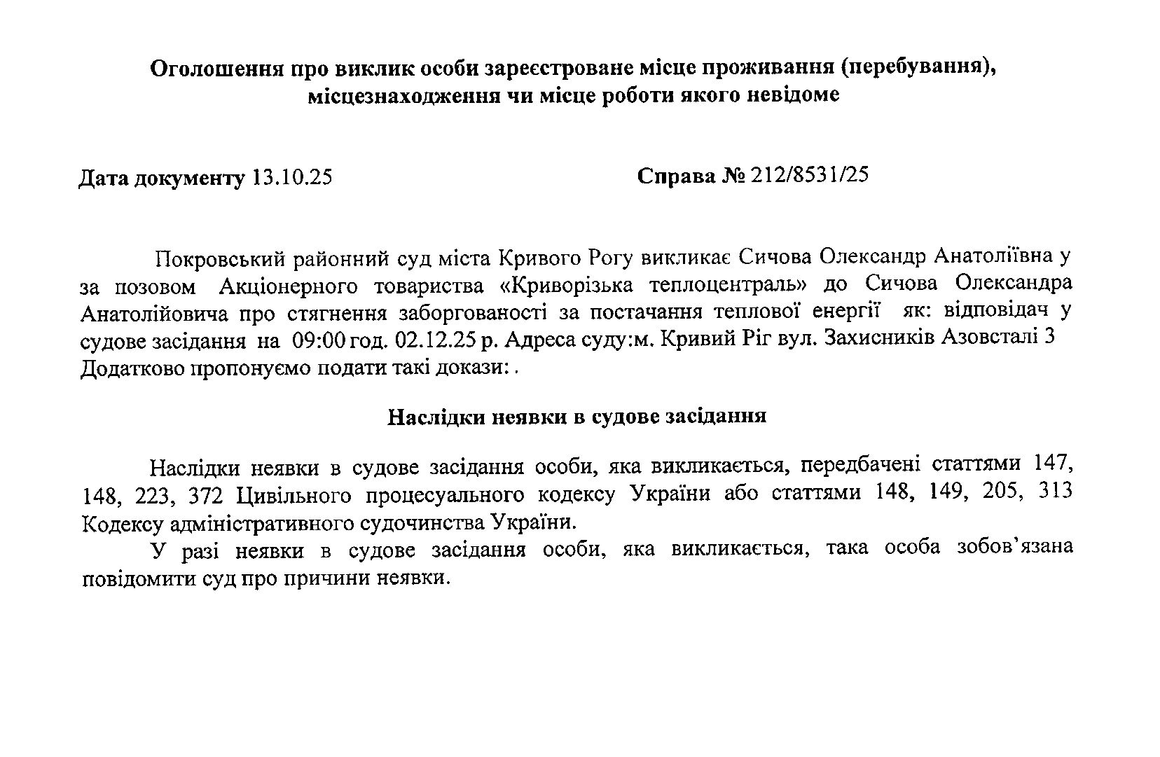 Оголошення про виклик до суду Сичова Олександра Анатолійовича