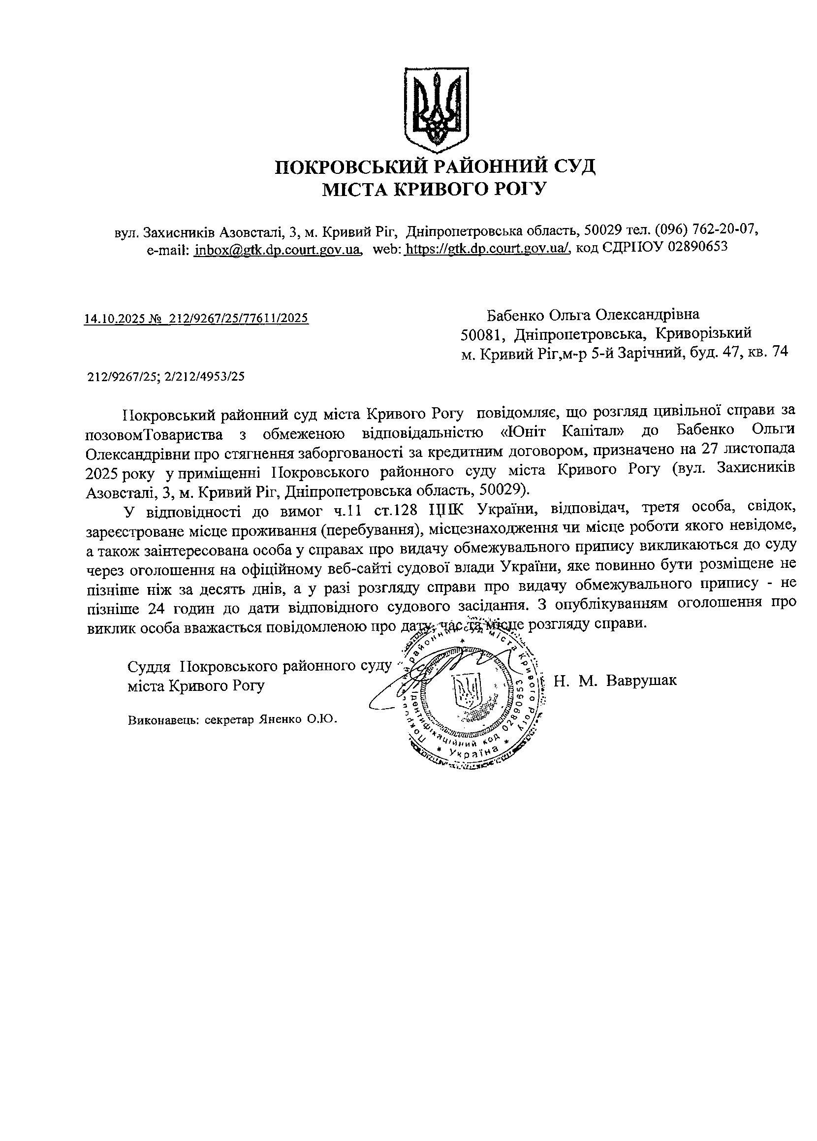 Оголошення про виклик до суду Бабенко Ольги Олександрівни