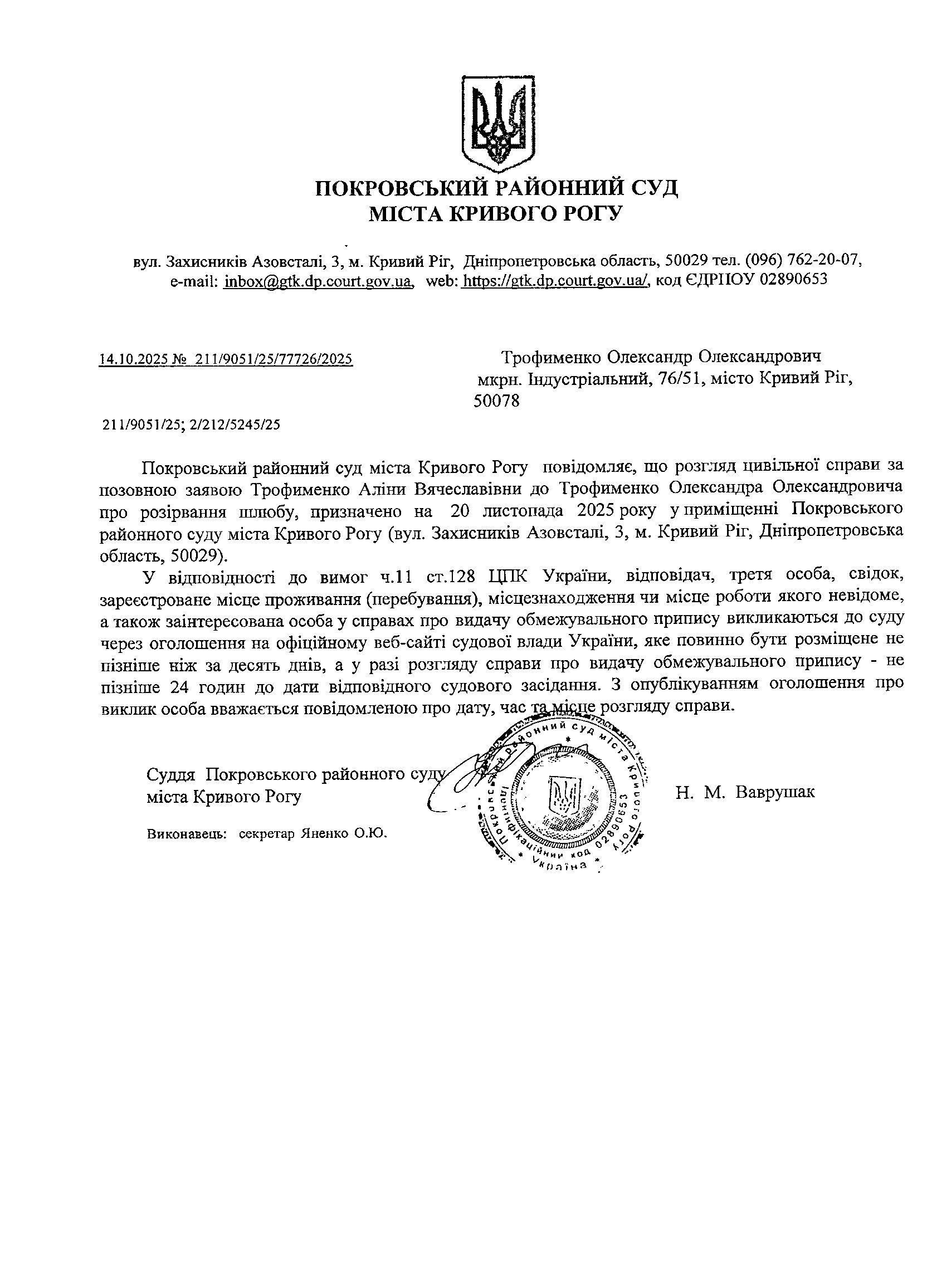 Оголошення про виклик до суду Трофименка Олександра Олександровича