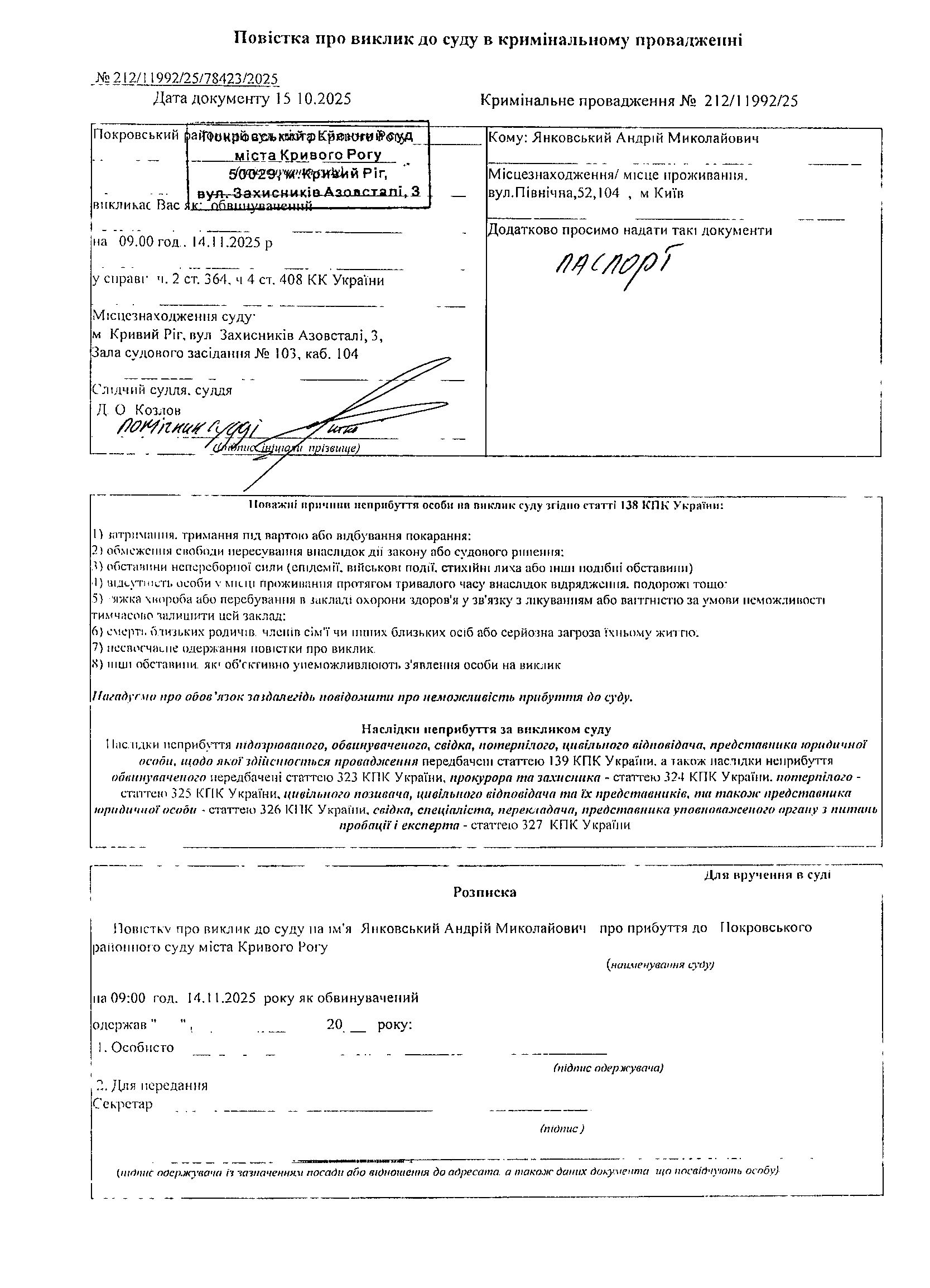 Оголошення про виклик до суду Янковськовського Андрія Миколайовича
