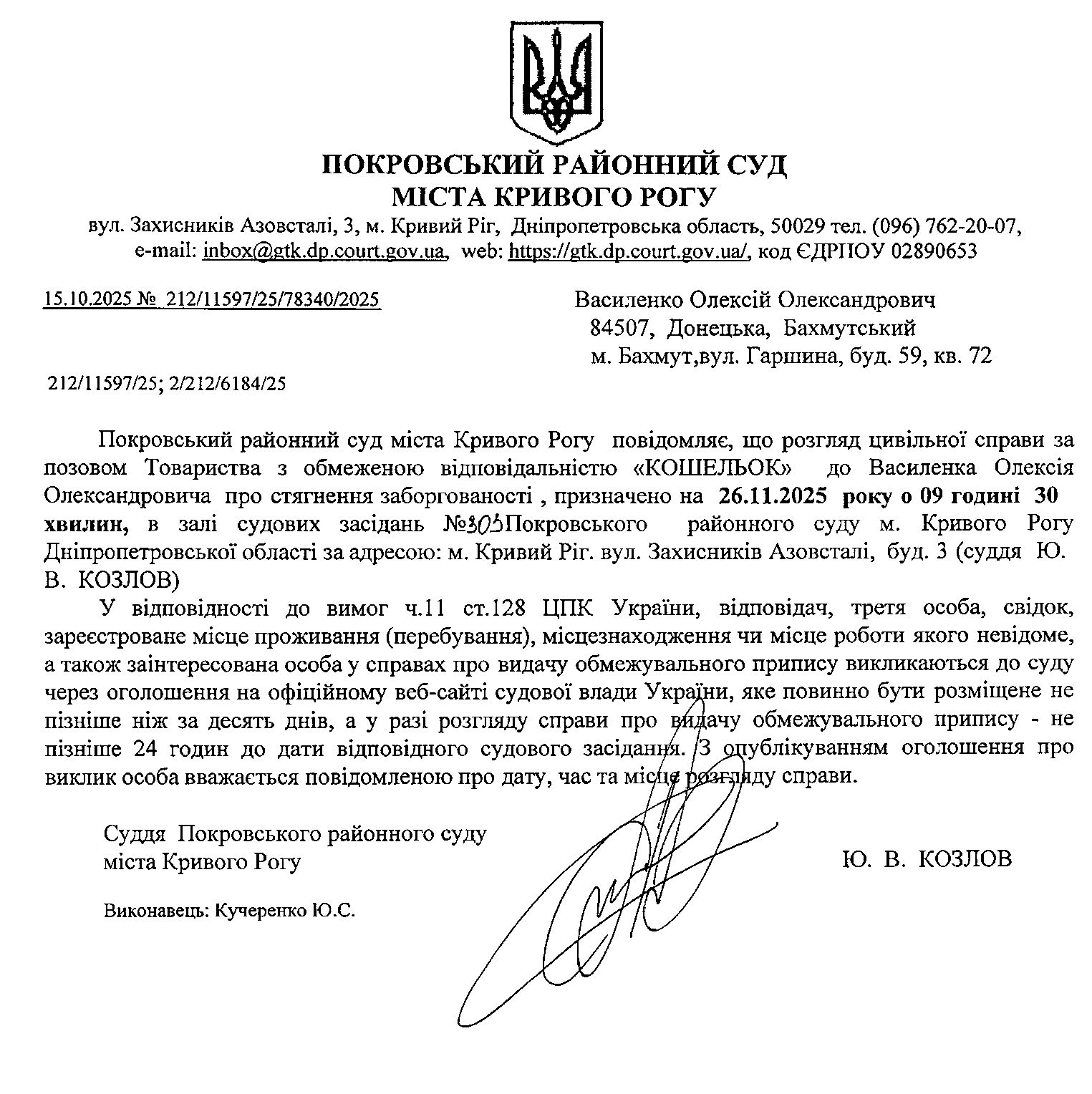 Оголошення про виклик до суду Василенка Олексія Олександровича