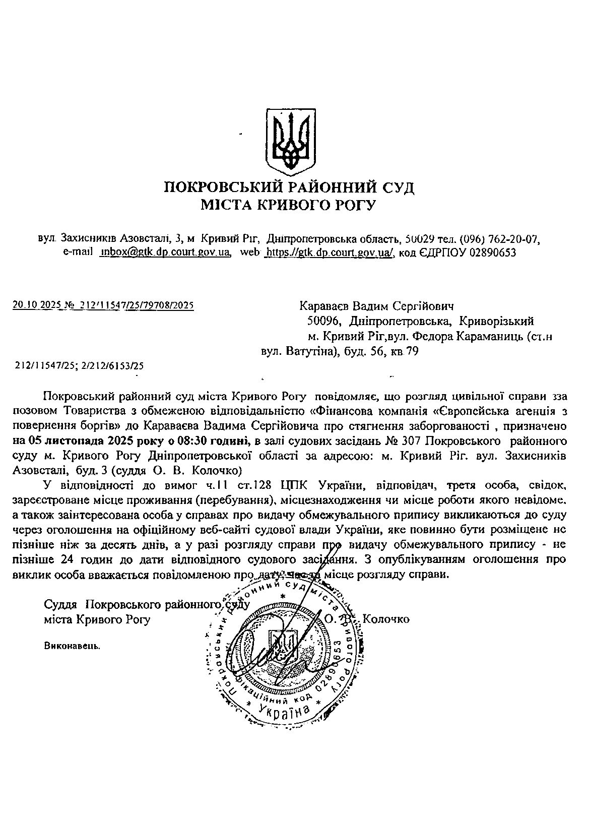Оголошення про виклик до суду Караваєва Вадима Сергійовича