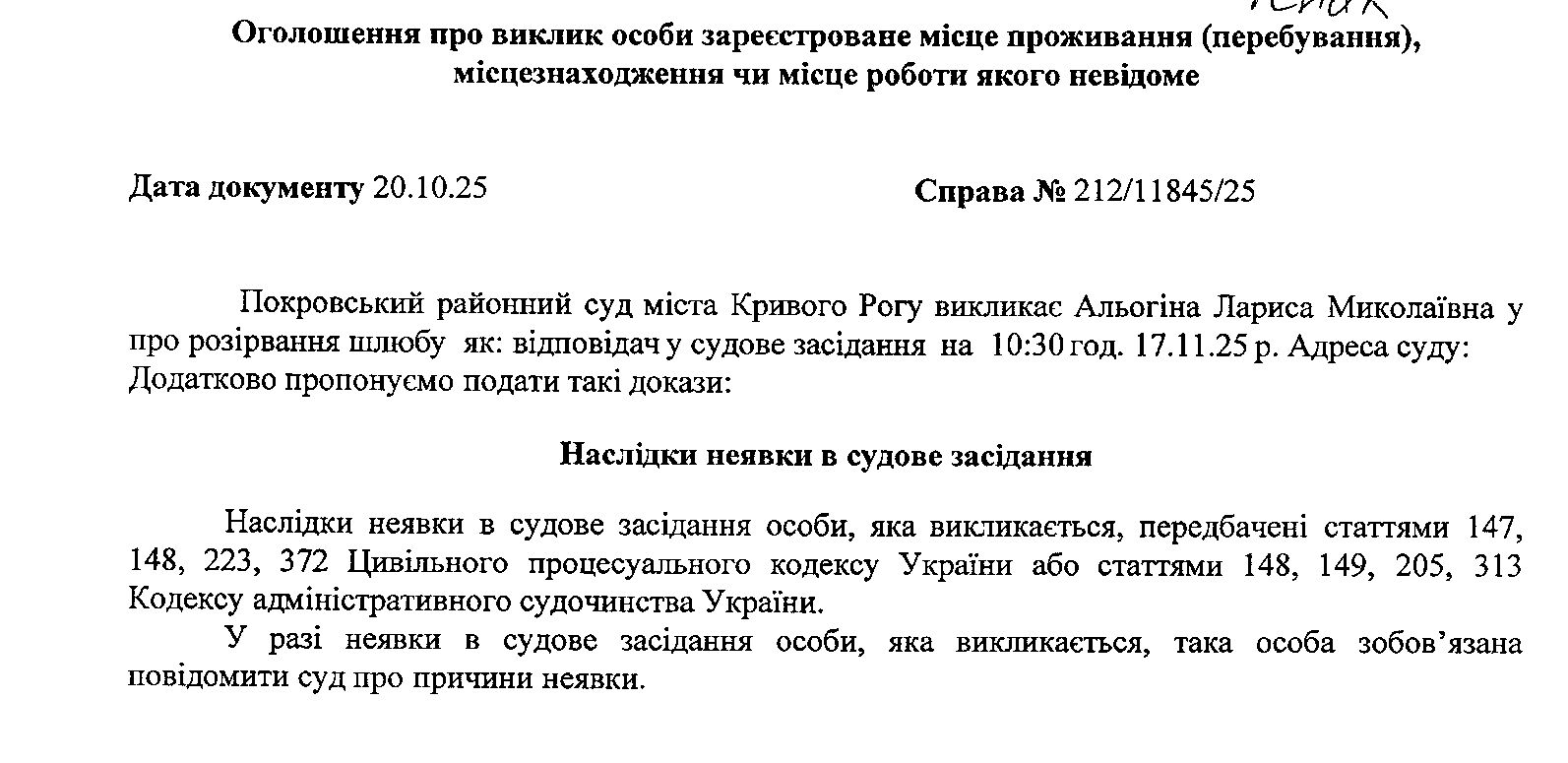 Оголошення про виклик до суду Альогіної Лариси Миколаївни