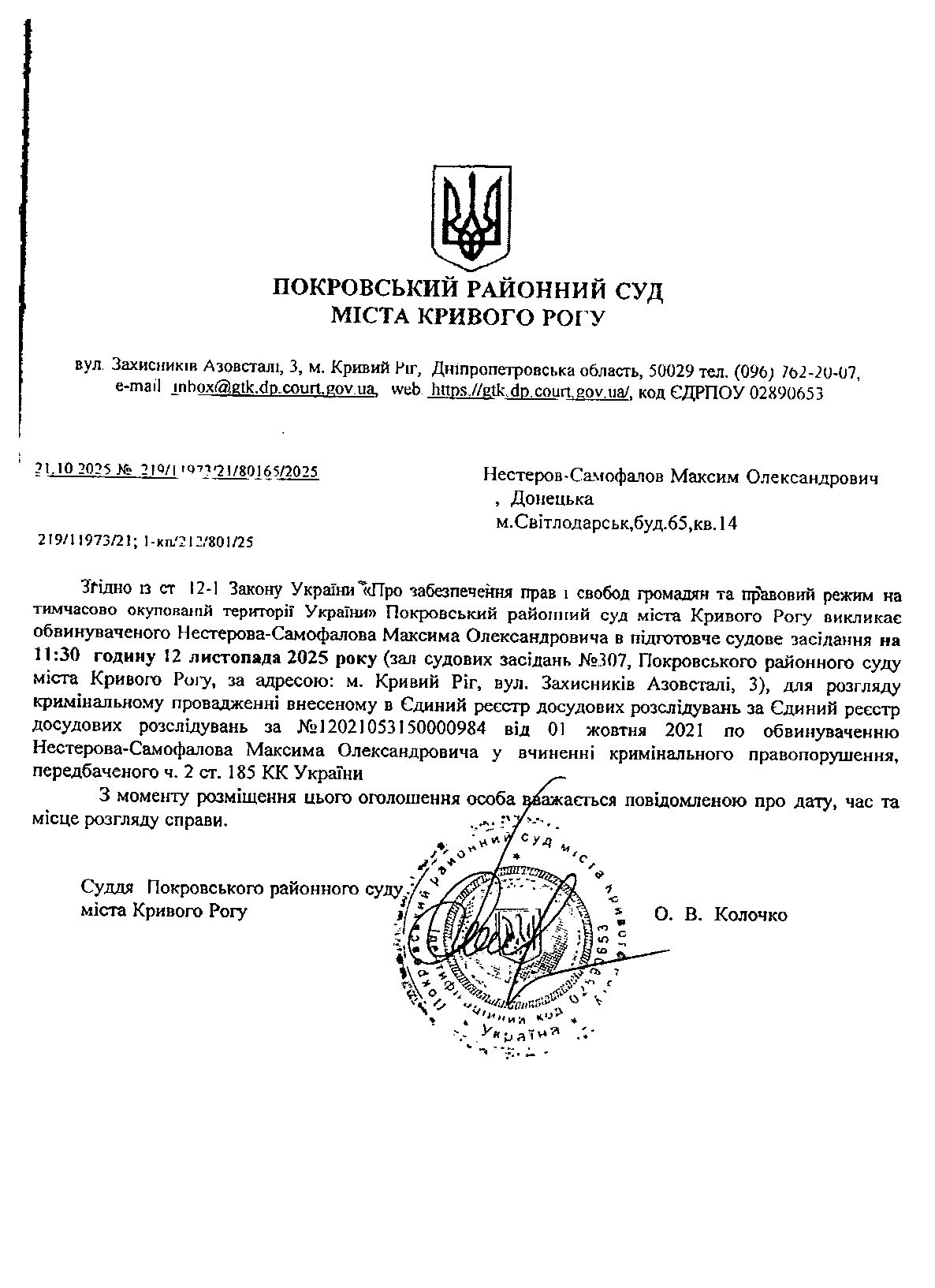 Оголошення про виклик до суду Нестерова - Самофалова Максима Олександровича