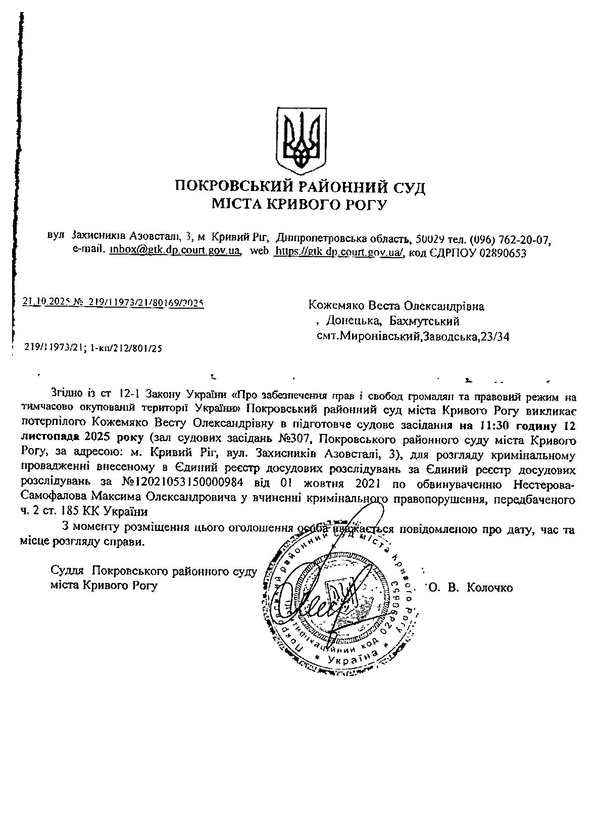 Оголошення про виклик до суду Кожемяко Вести Олександрівни