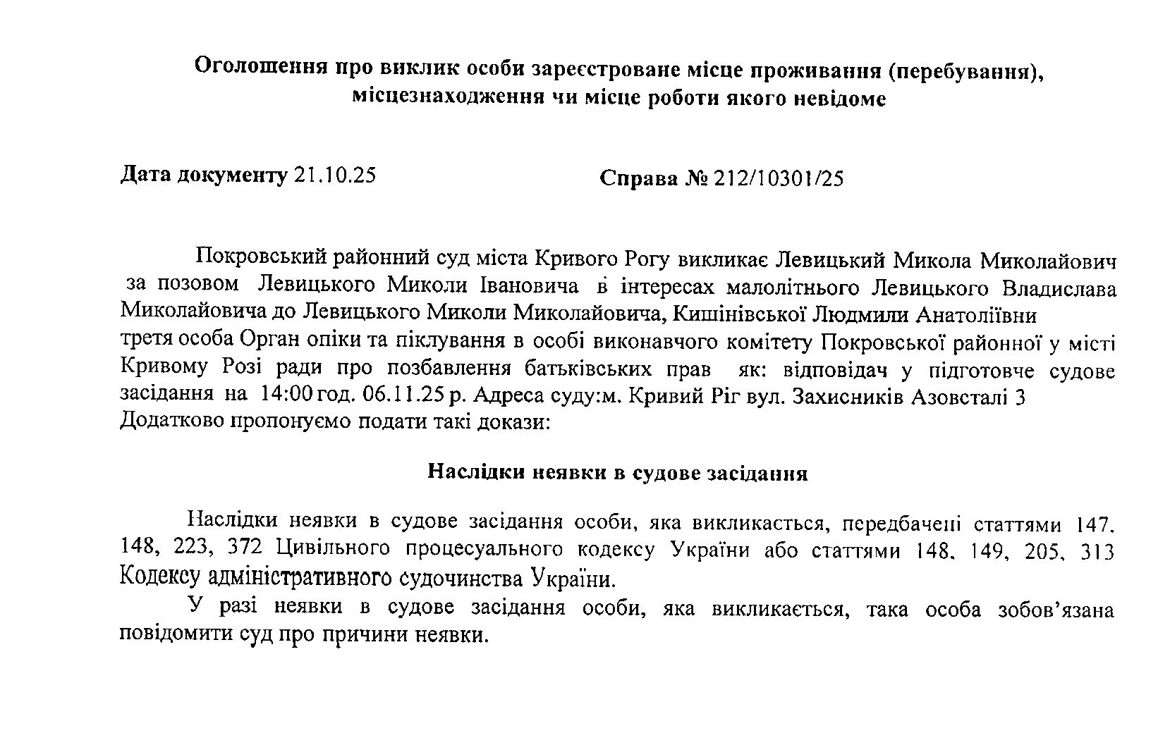 Оголошення про виклик до суду Левицького Миколи Миколайовича