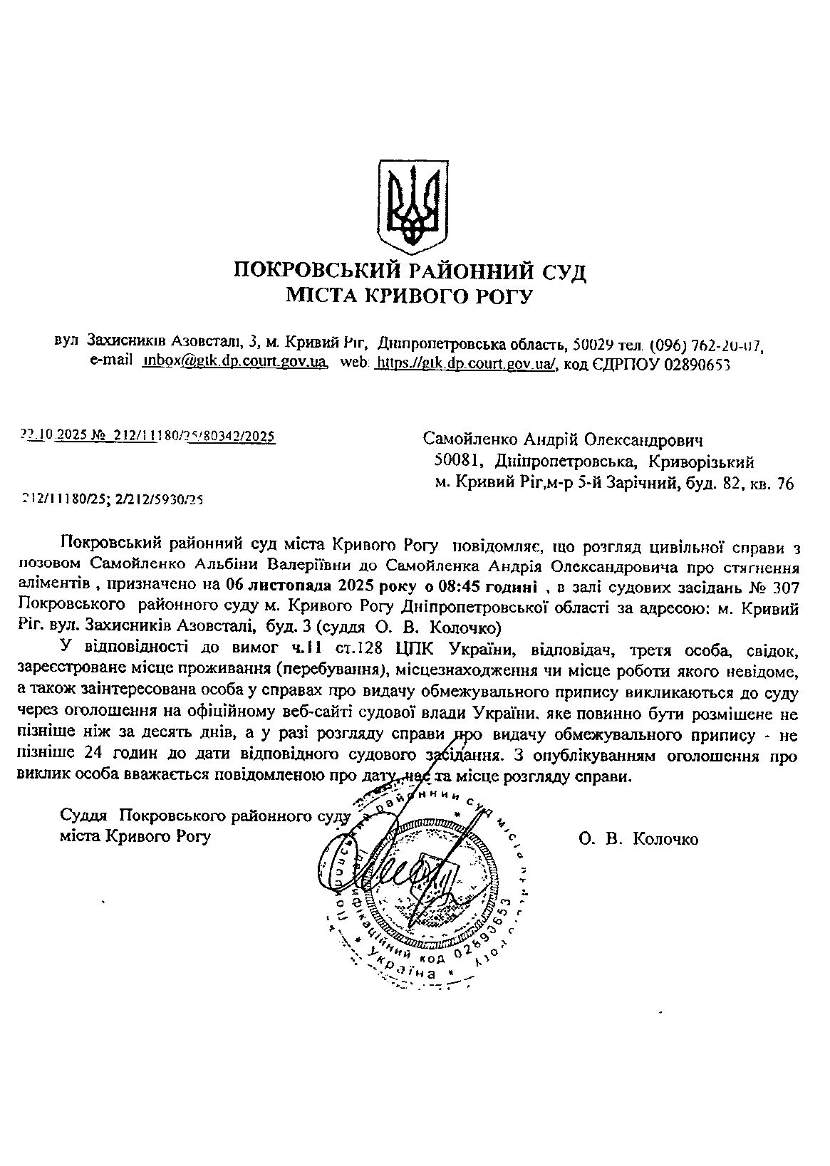 Оголошення про виклик до суду Самойленка Андрія Олександровича