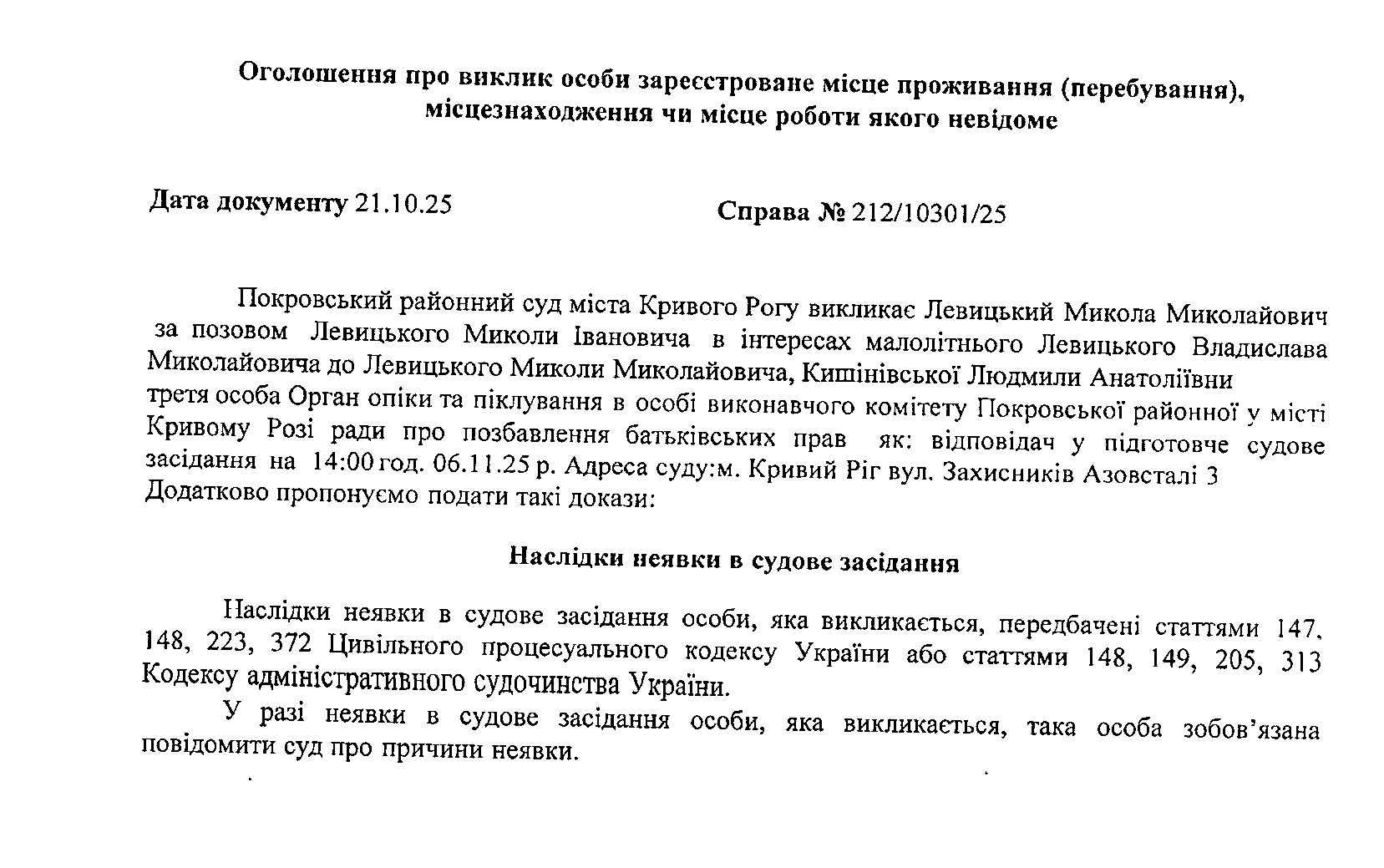 Оголошення про виклик до суду Левицького Миколи Миколайовича