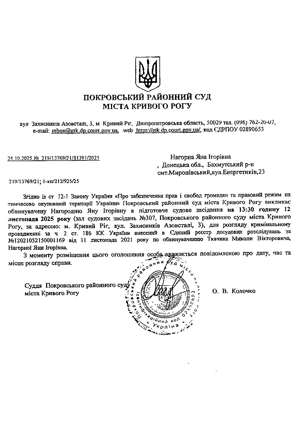 Оголошення про виклик до суду Нагорної Яни Ігорівни