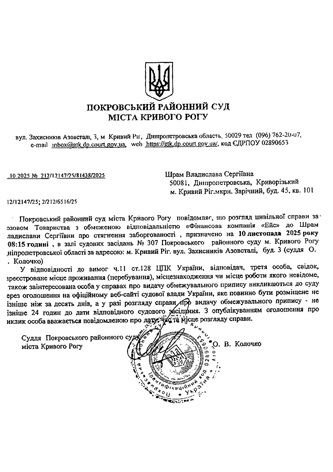Оголошення про виклик до суду Шрам Владислави Сергіївни
