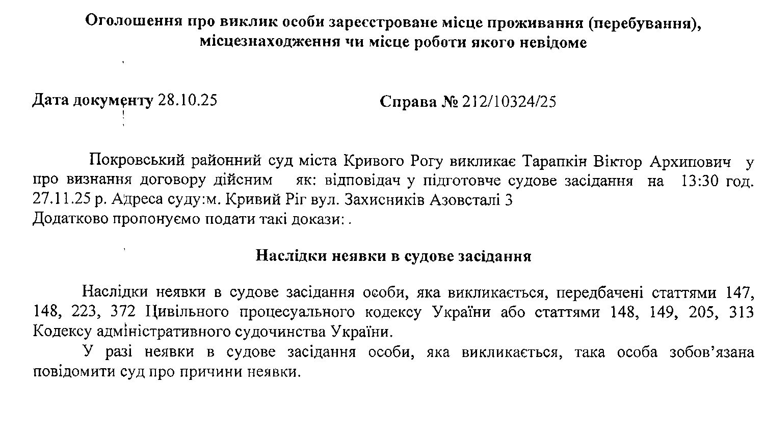 Оголошення про виклик до суду Тарапкіна Віктора Архиповича