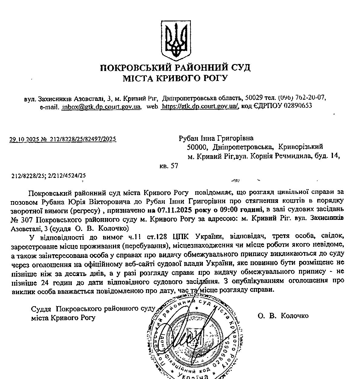 Оголошення про виклик до суду Рубан Інни Григорівни