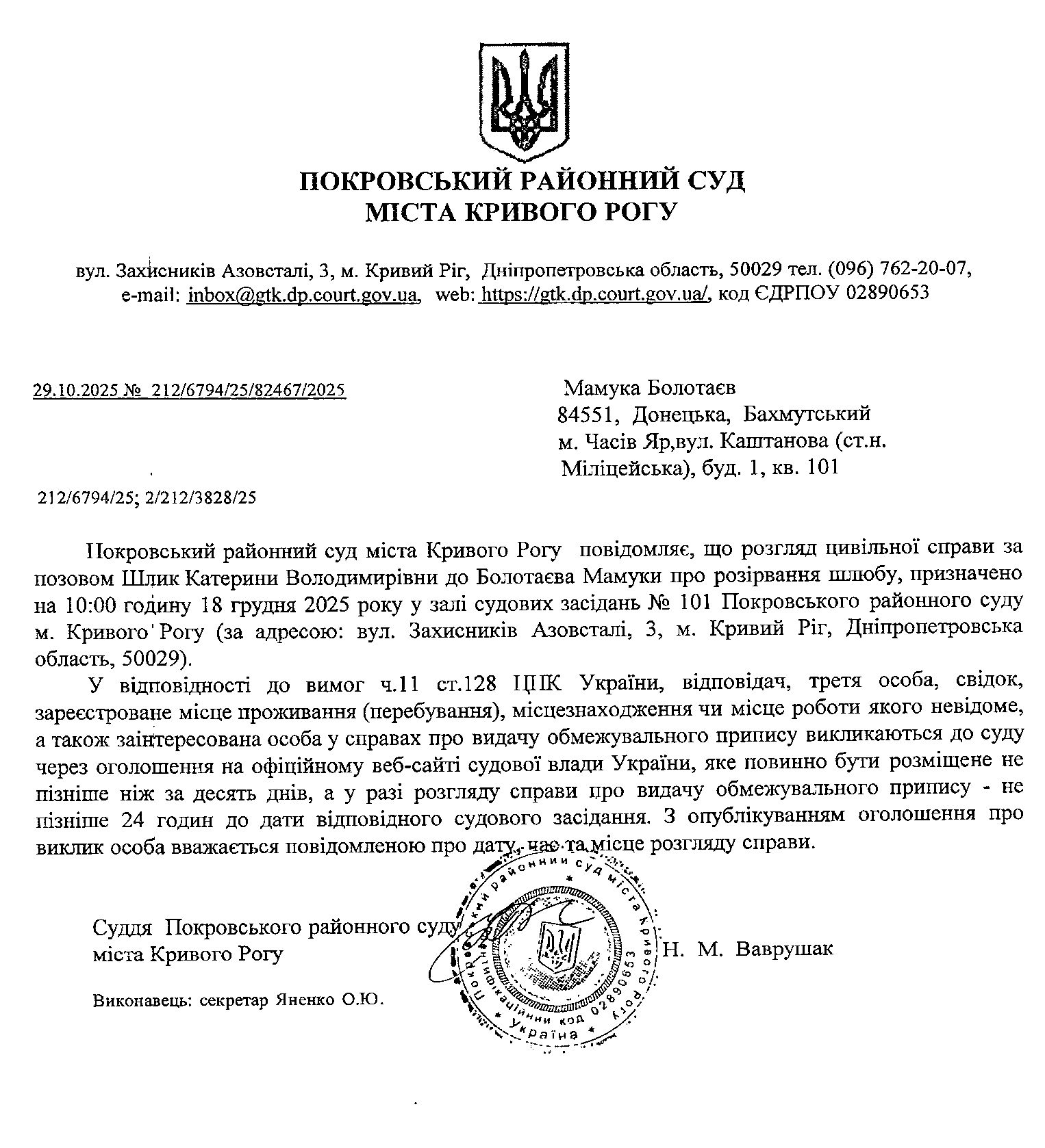 Оголошення про виклик до суду Мамуки Болотаєва