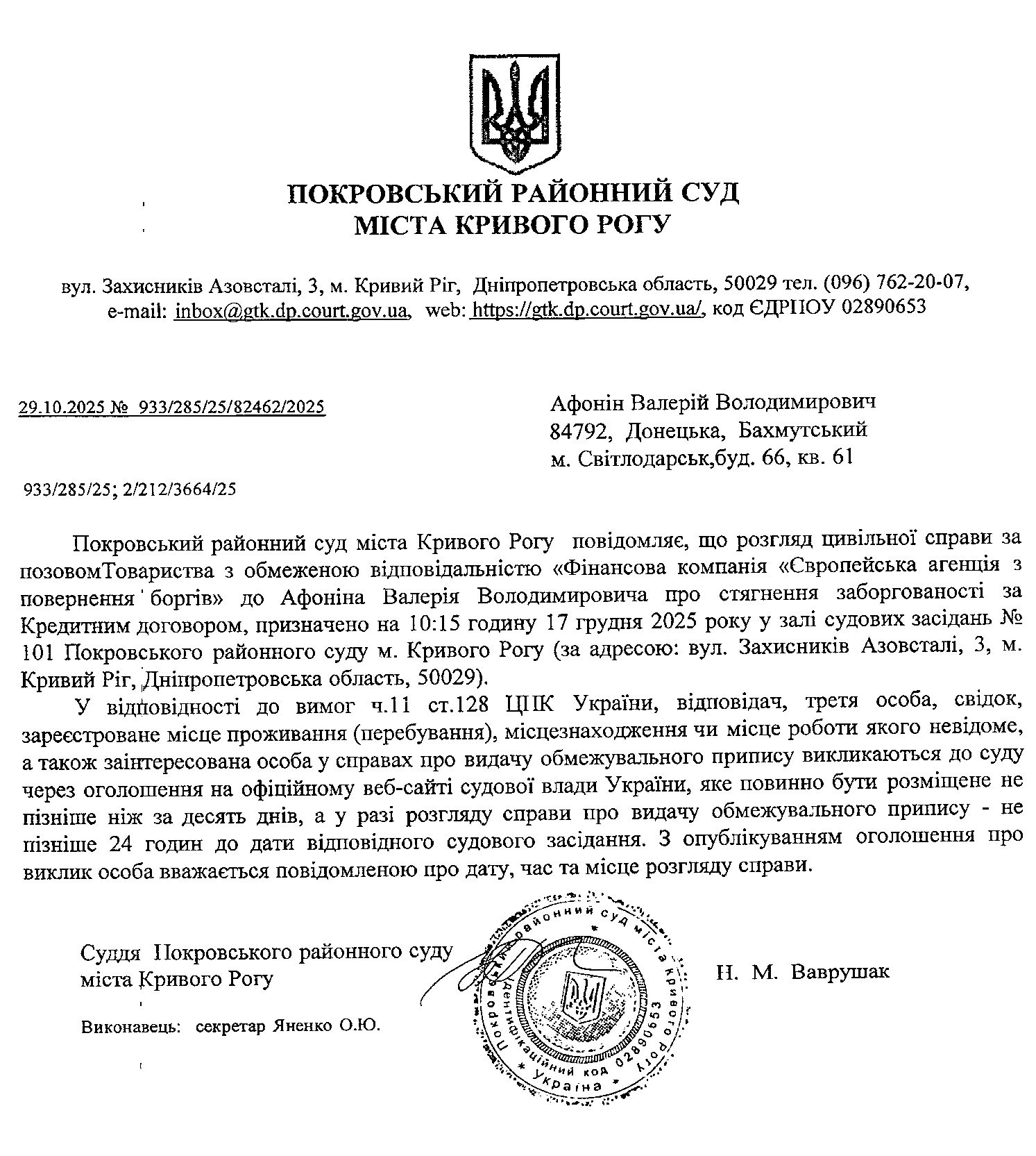 Оголошення про виклик до суду Афоніна Валерія Володимировича