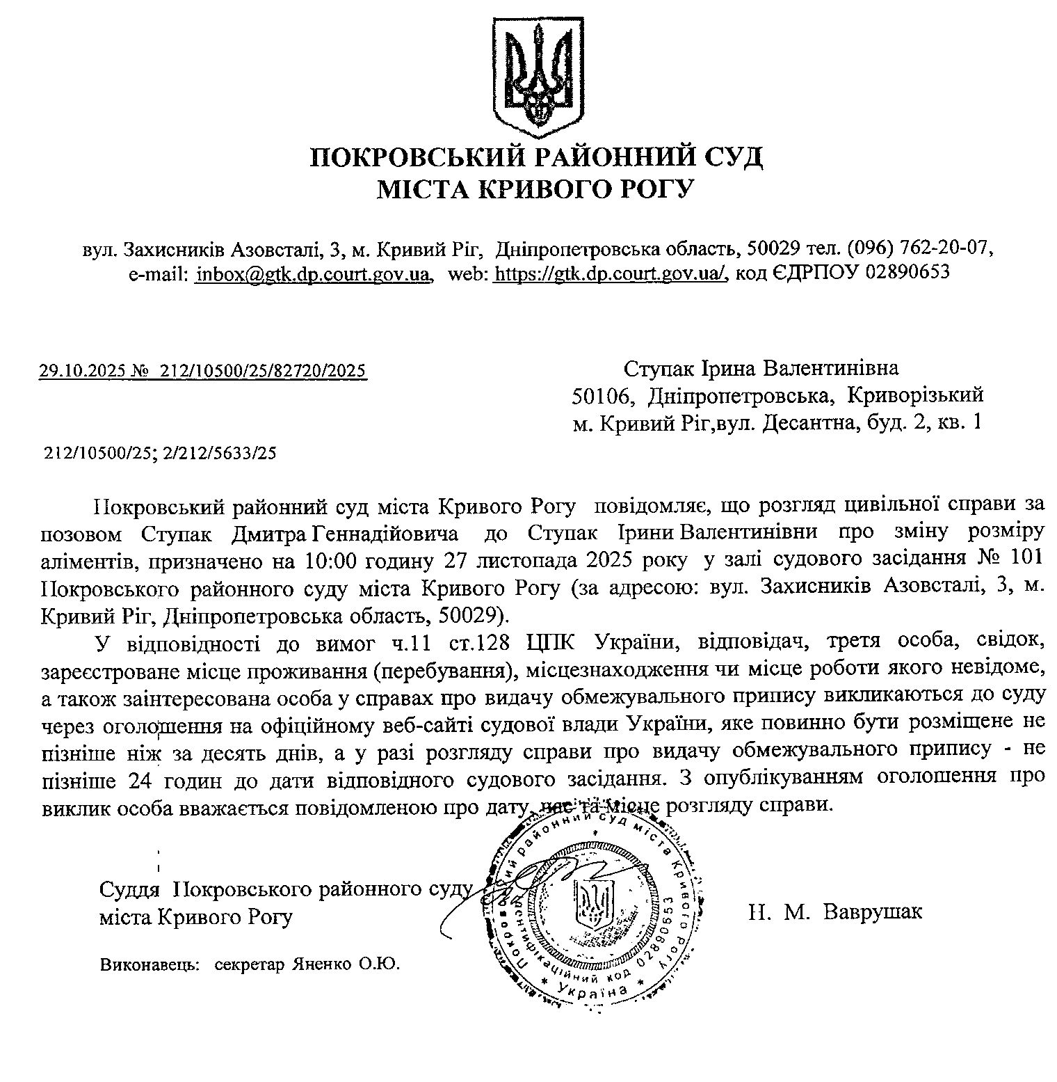 Оголошення про виклик до суду Ступак Ірини Валентинівни