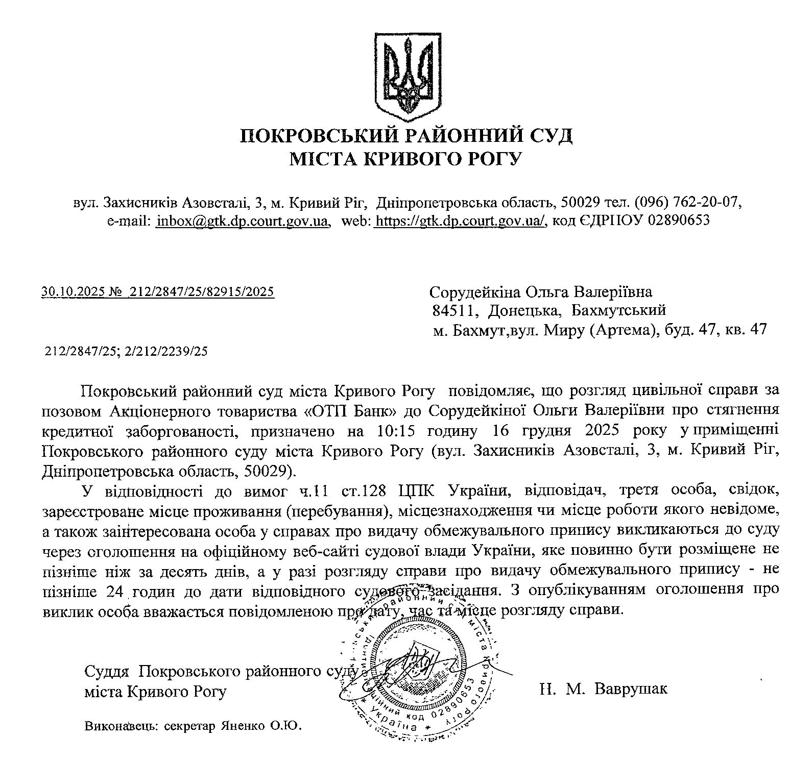 Оголошення про виклик до суду Сорудейкіної Ольги Валеріївни
