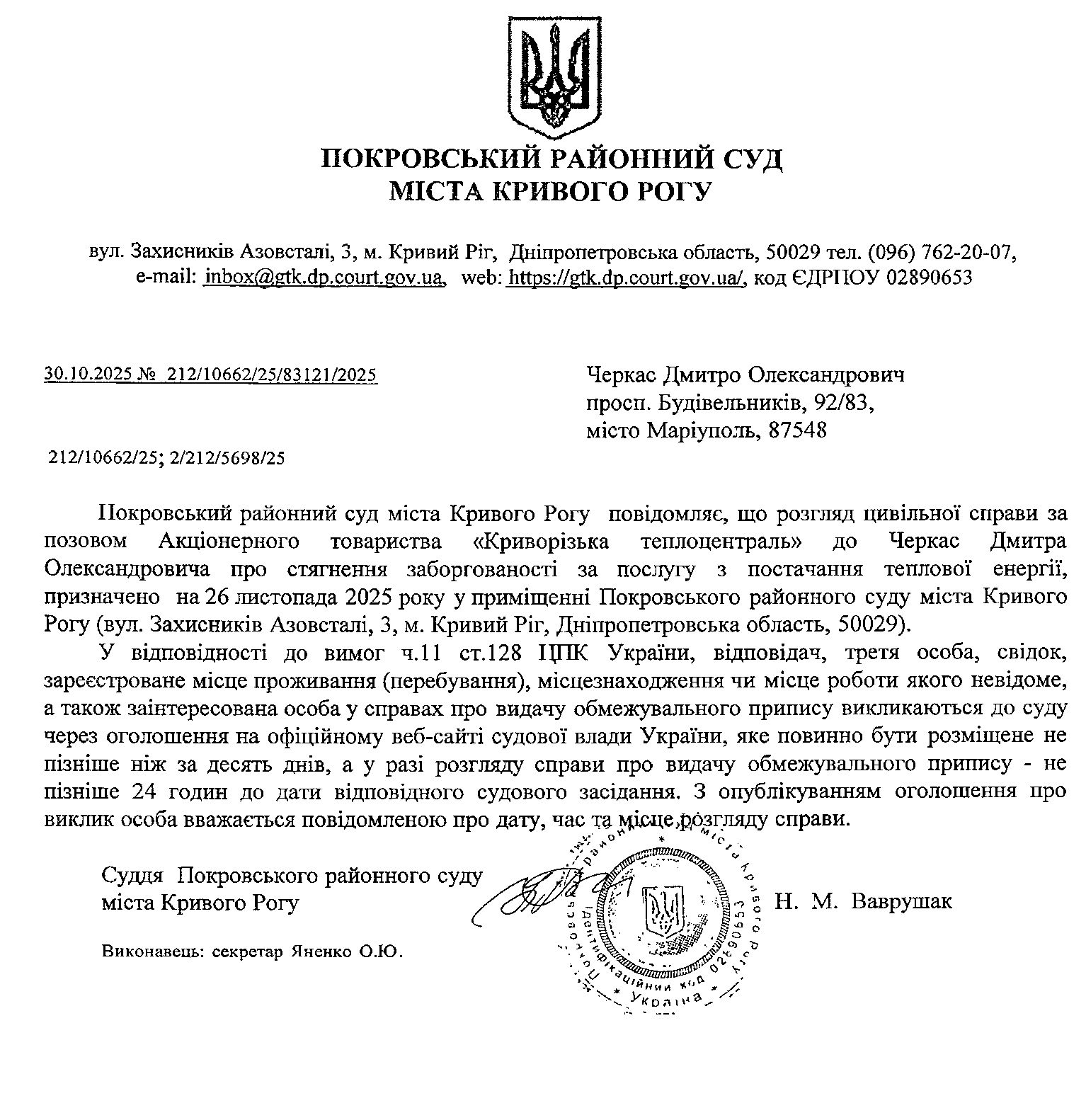 Оголошення про виклик до суду Черкаса Дмитра Олександровича