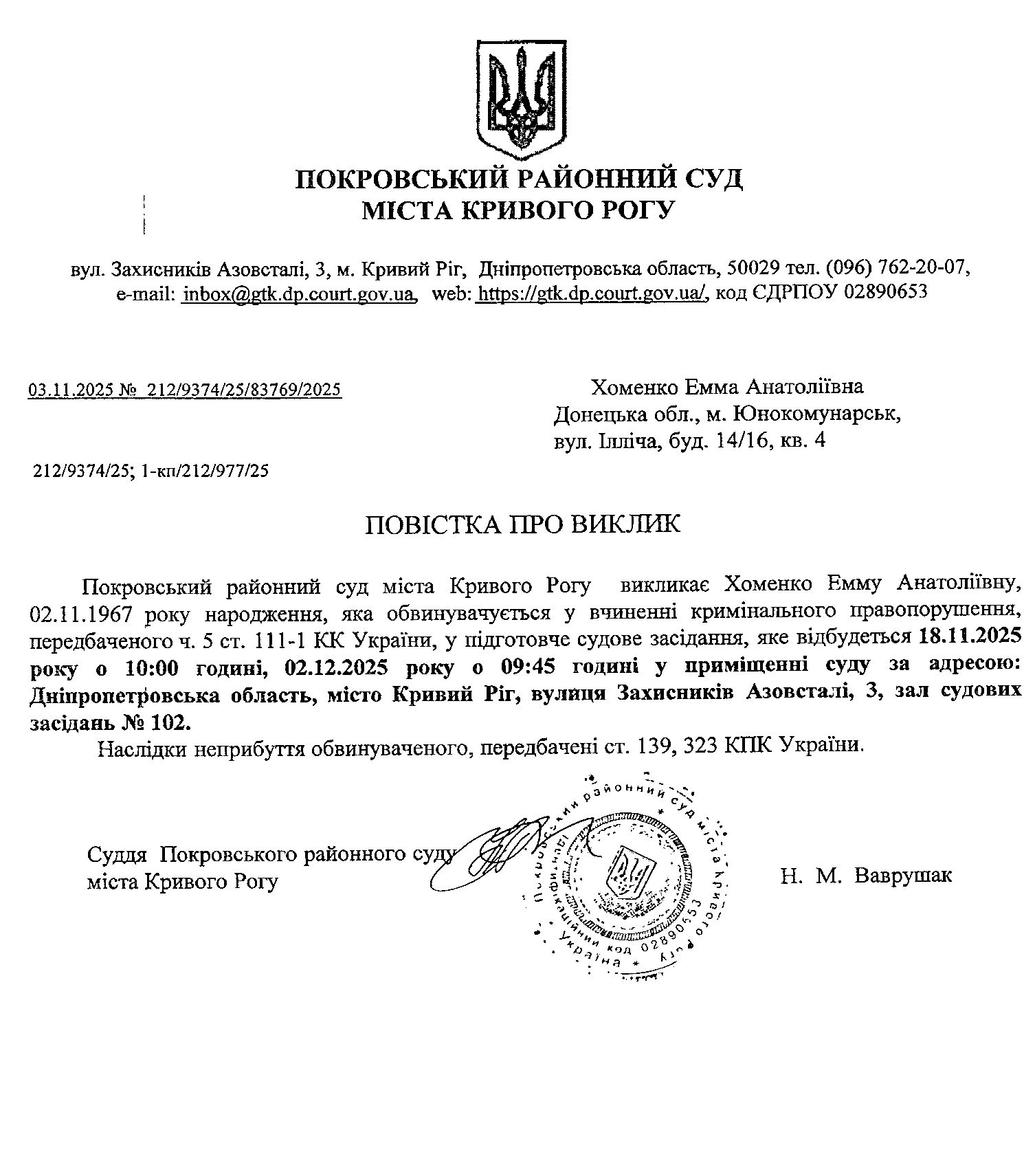 Оголошення про виклик до суду Хоменко Емми Анатоліївни