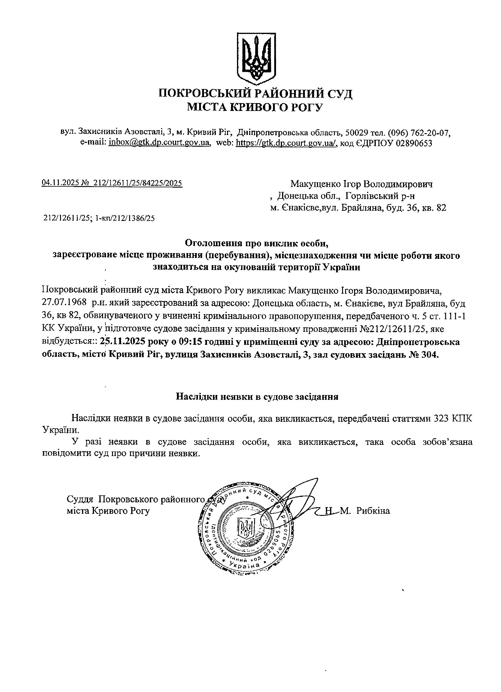 Оголошення про виклик до суду Макущенка Ігоря Володимировича