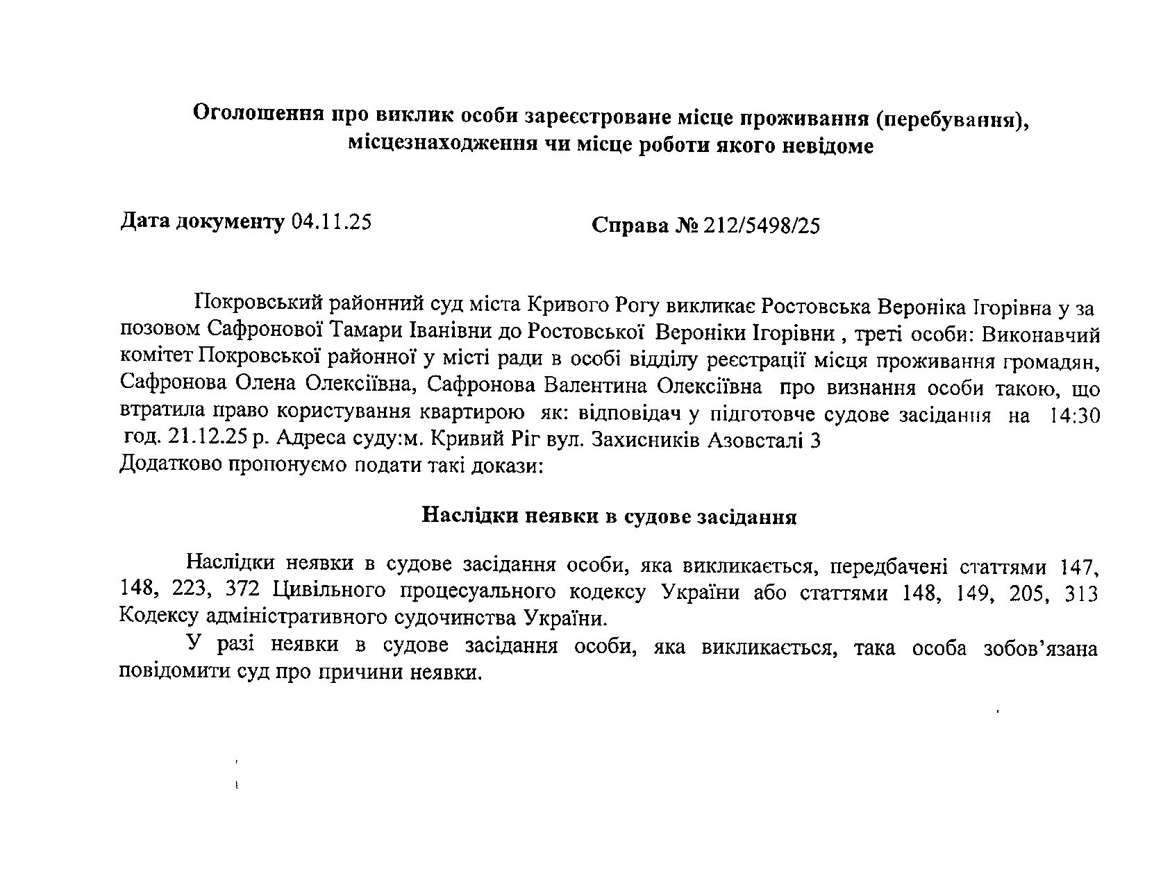 Оголошення про виклик до суду Ростовської Вероніки Ігорівни