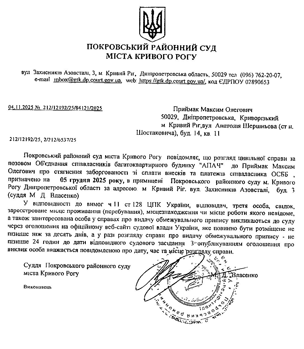 Оголошення про виклик до суду Приймака Максима Олеговича