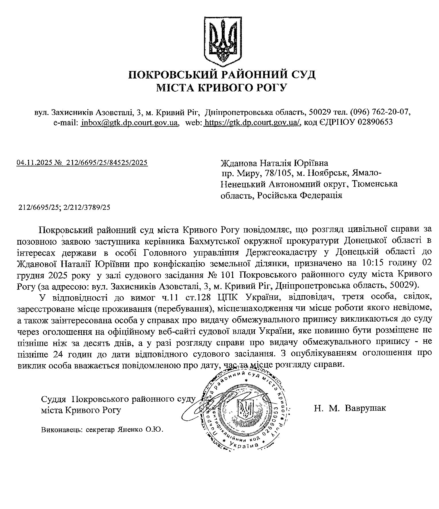 Оголошення про виклик до суду Жданової Наталії Юріївни