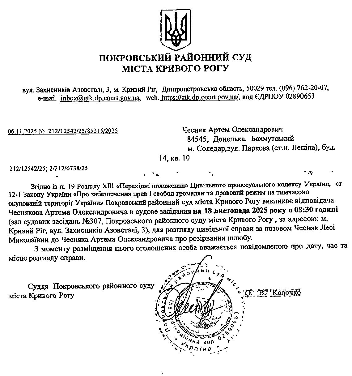 Оголошення про виклик до суду Чесняка Артема Олександровича