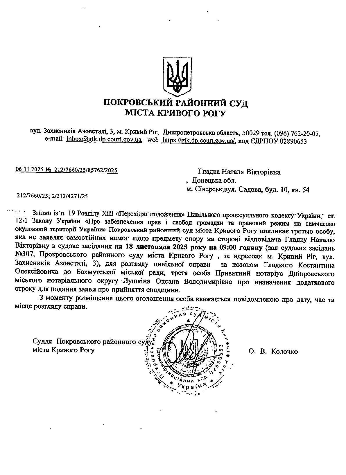 Оголошення про виклик до суду Гладкої Наталі Вікторівни