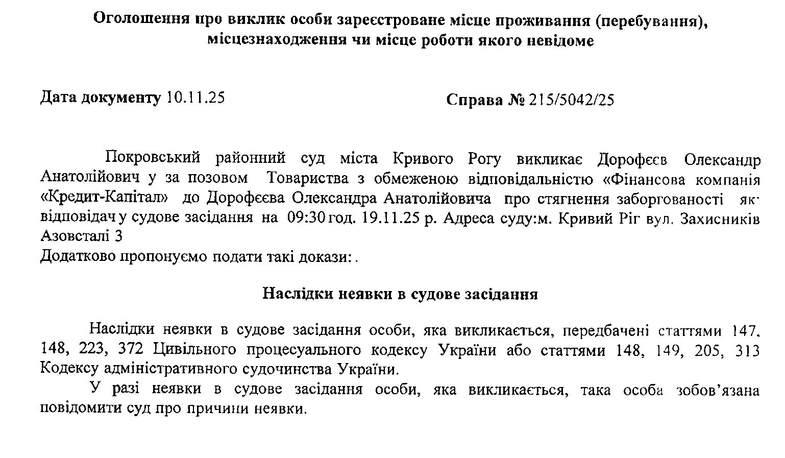 ОГОЛОШЕННЯ ПРО ВИКЛИК ДО СУДУ