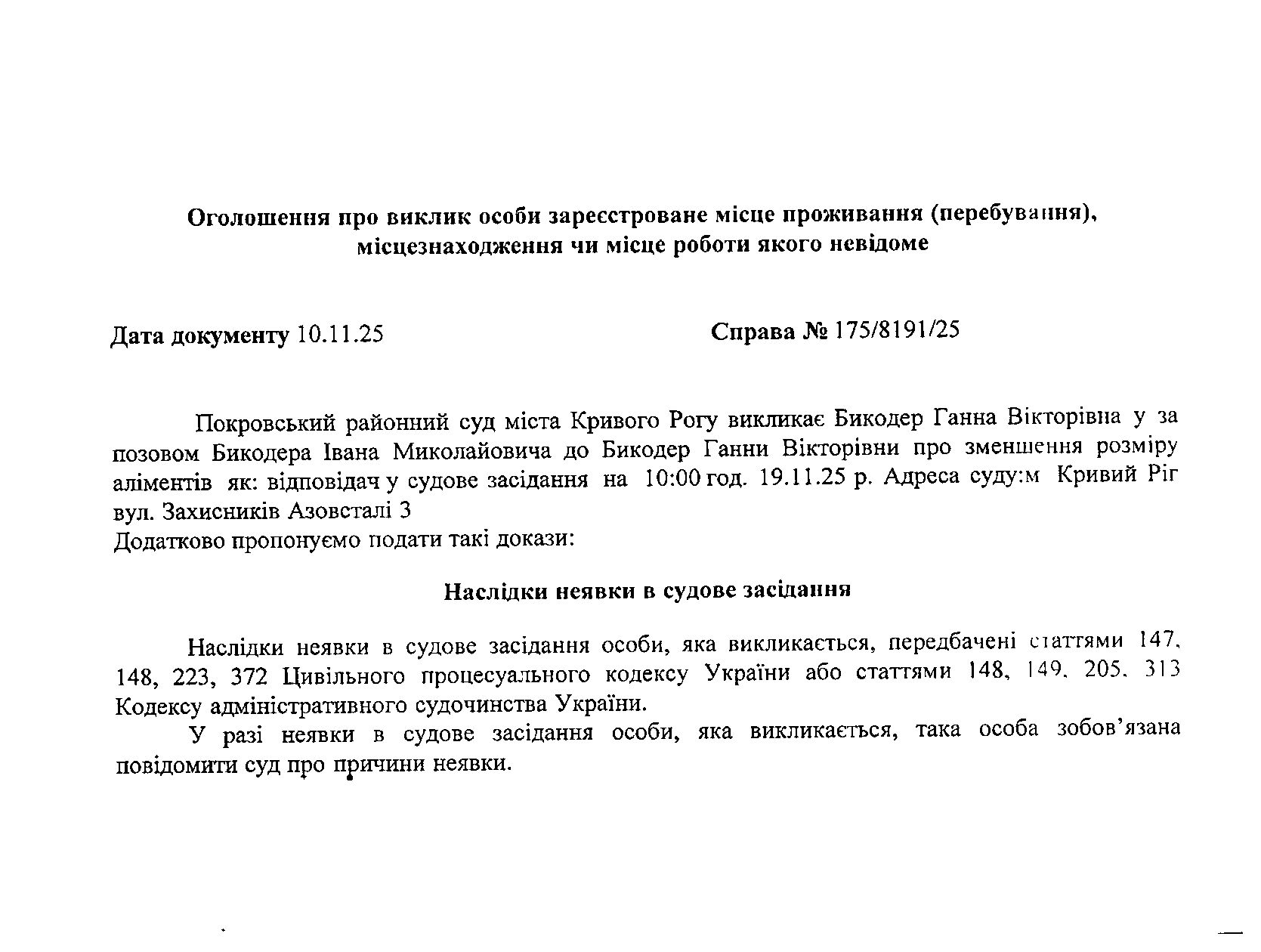Оголошення про виклик до суду Бикодер Ганни Вікторівни