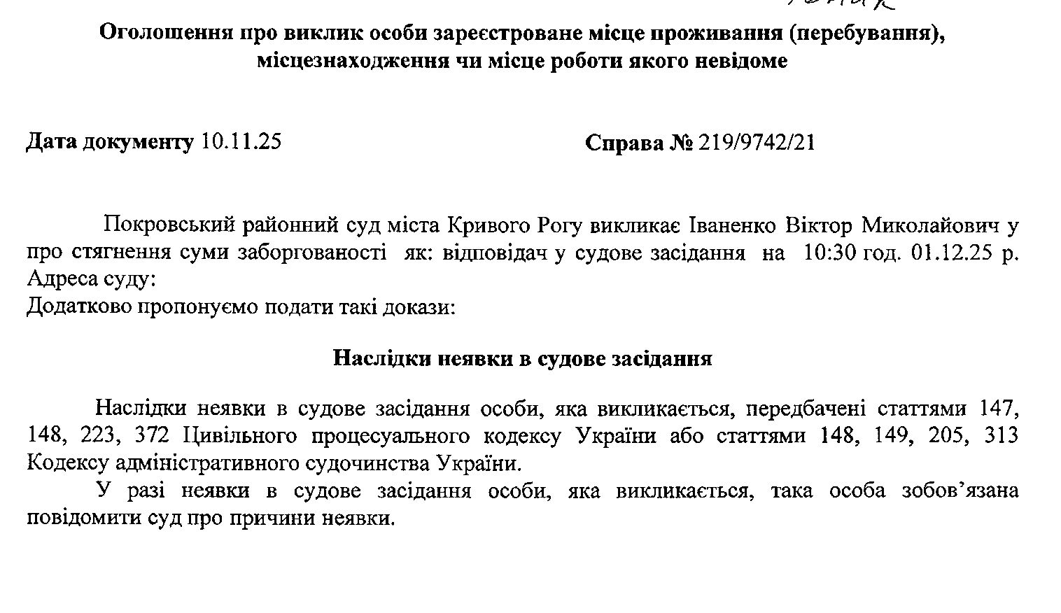 Оголошення про виклик до суду Іваненко Віктора Миколайовича