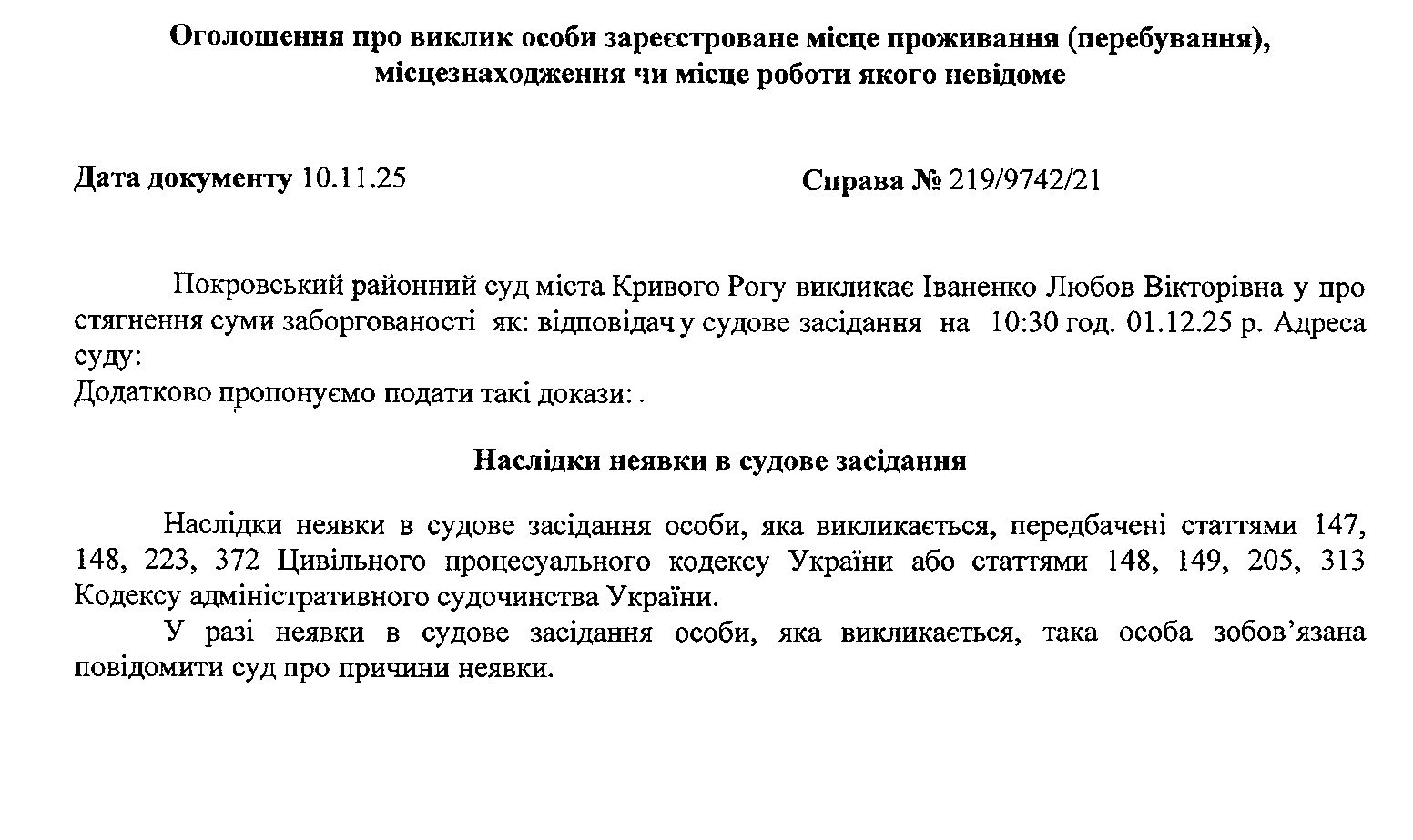 Оголошення про виклик до суду Іваненко Любові Вікторівни
