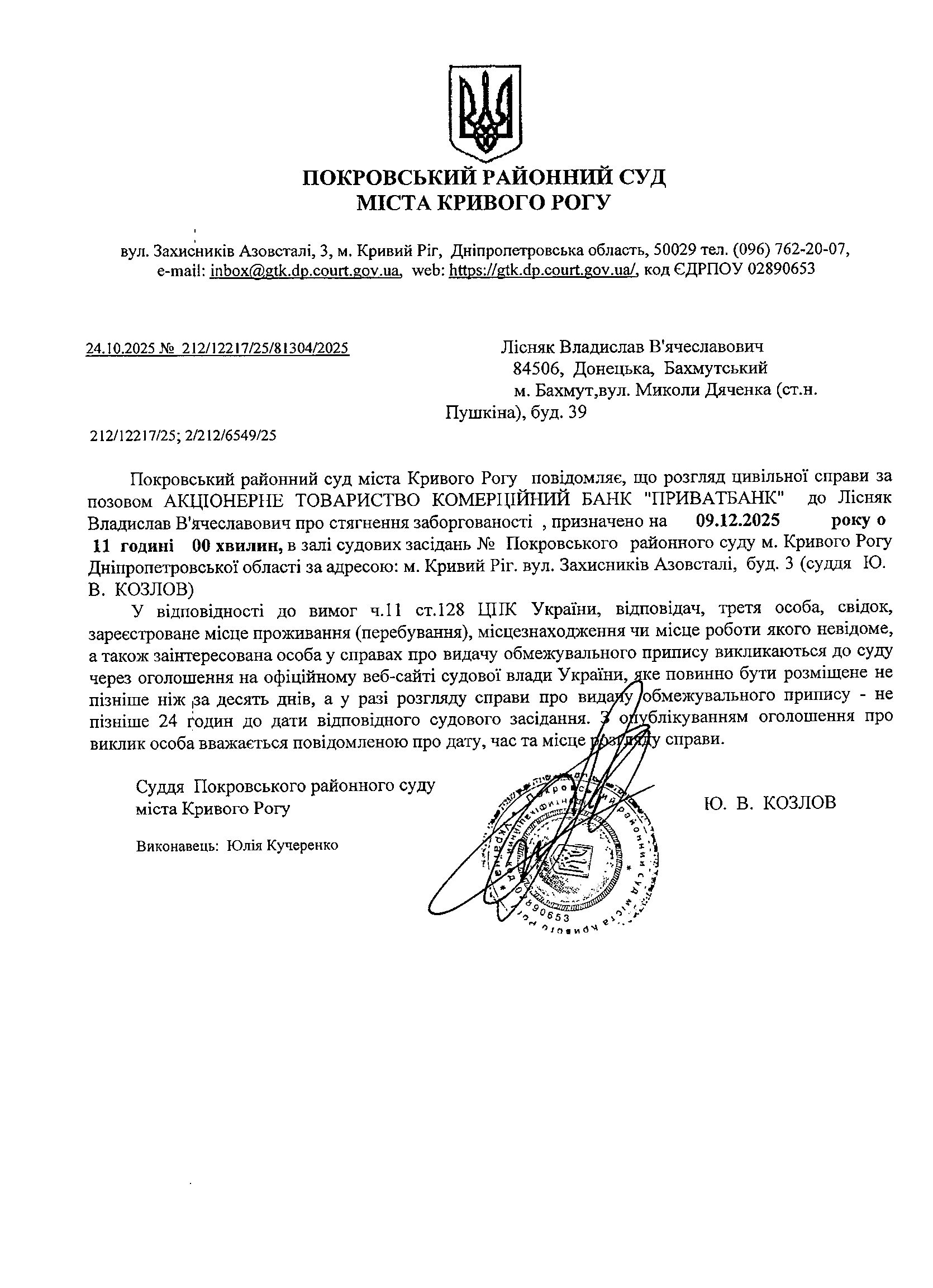 Оголошення про виклик до суду Лісняка Владислава В'ячеславовича