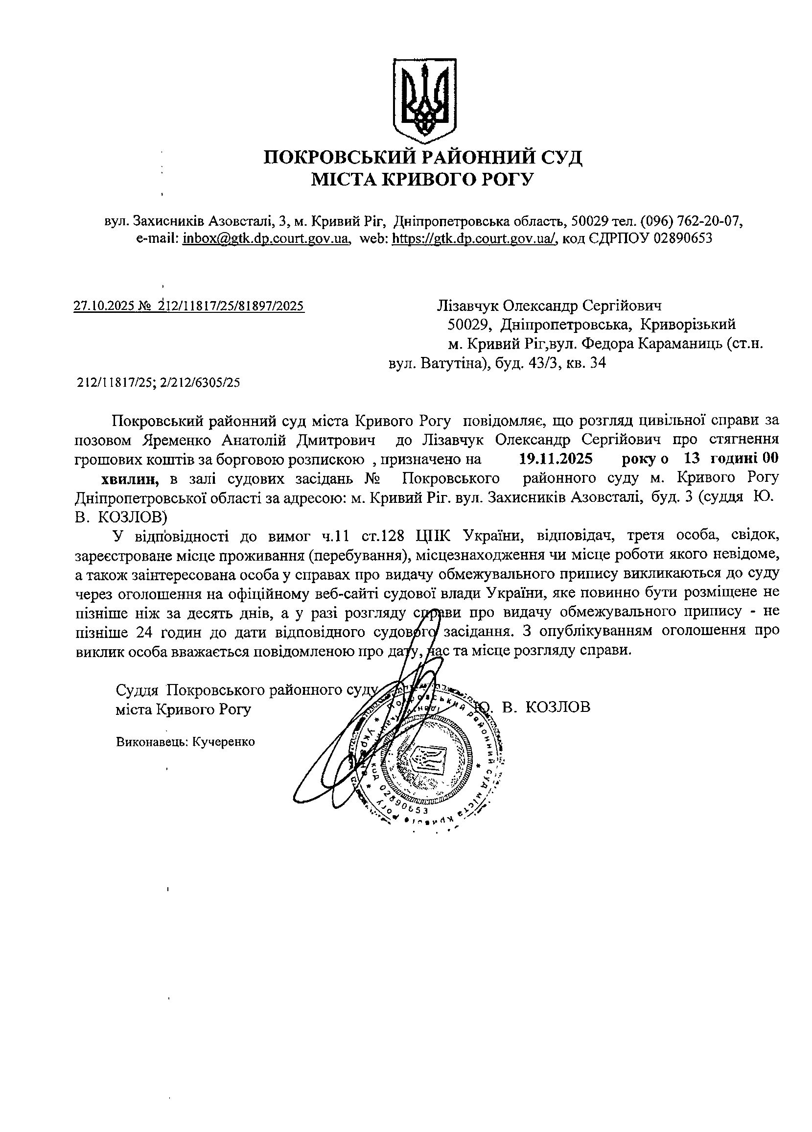 Оголошення про виклик до суду Лізавчука Олександра Сергійовича