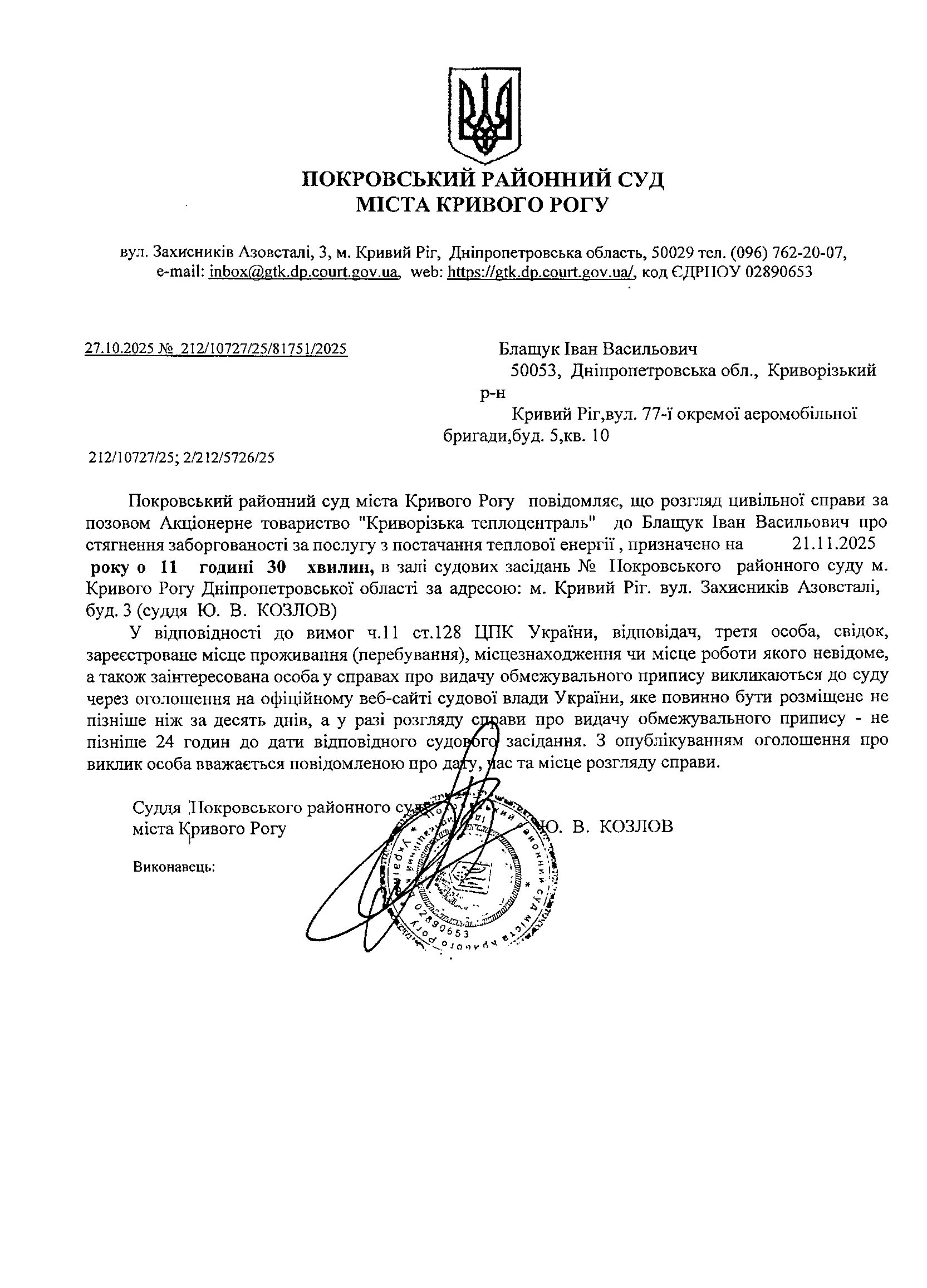 Оголошення про виклик до суду Блащука Івана Васильовича