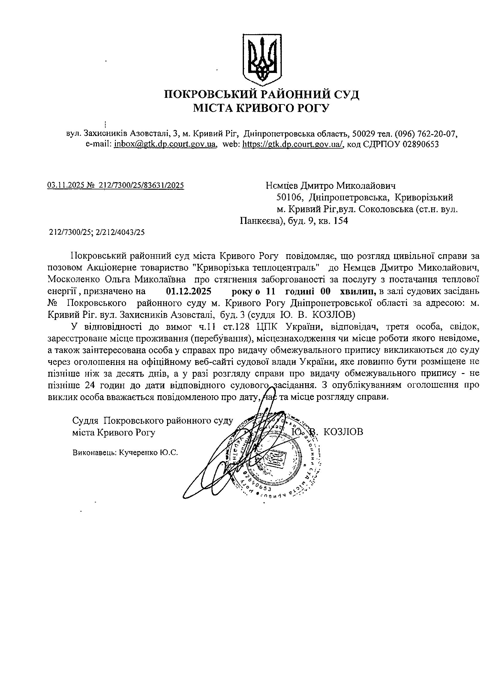 Оголошення про виклик до суду Нємцева Дмитра Миколайовича