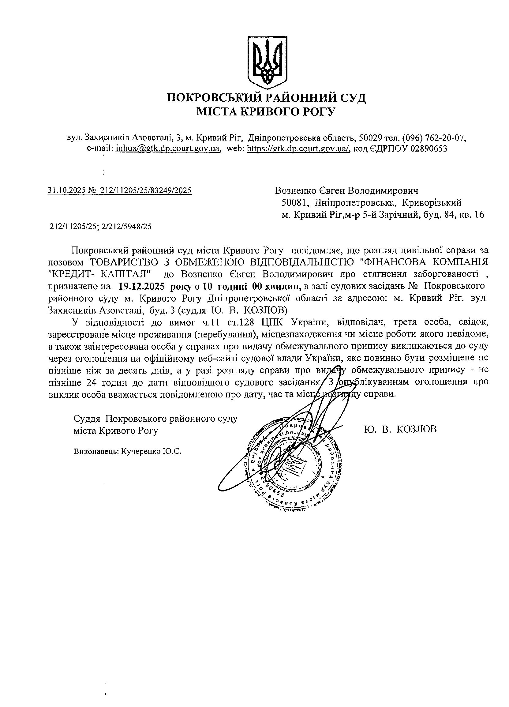 Оголошення про виклик до суду Возненка Євгена Володимировича