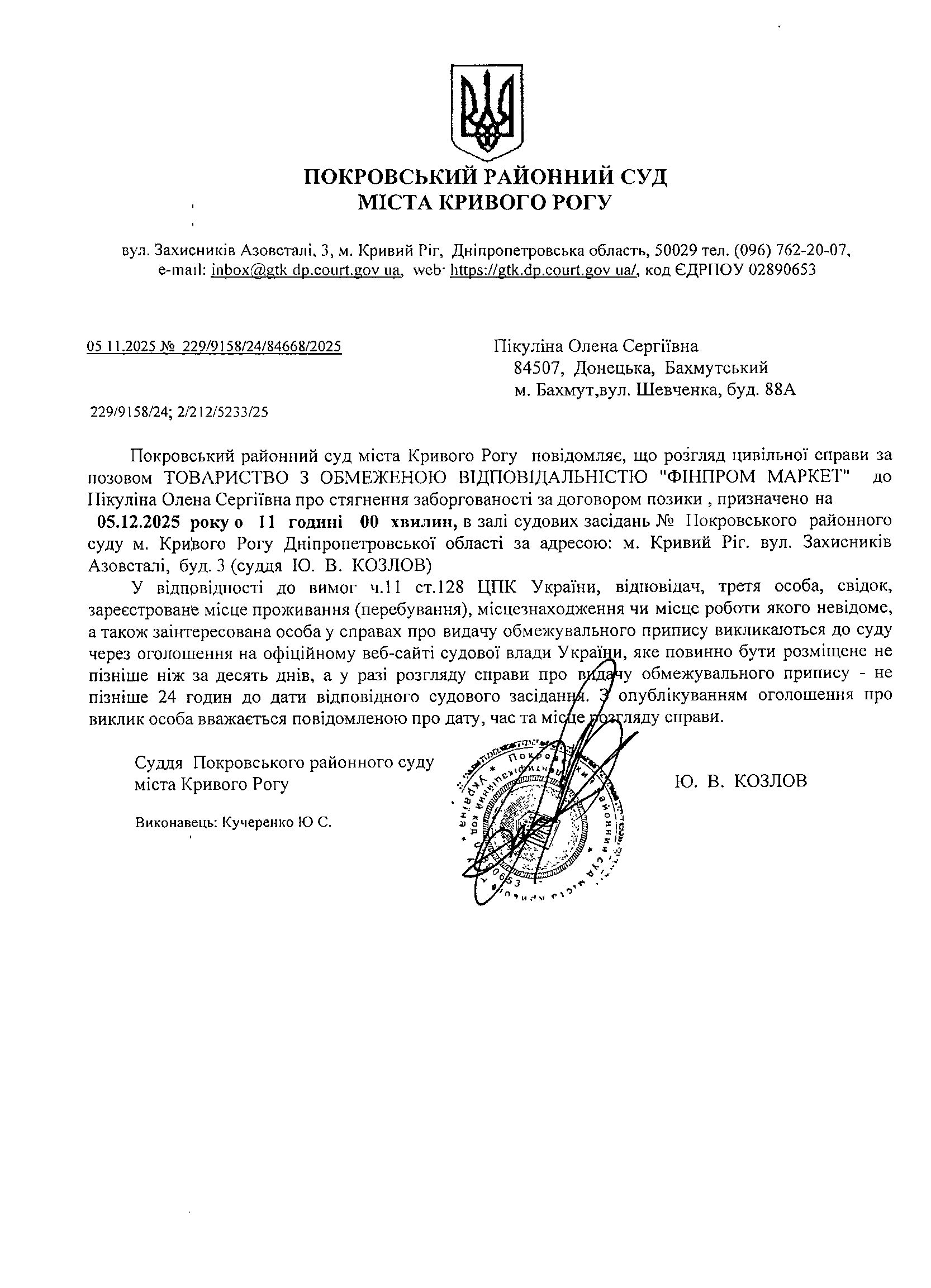 Оголошення про виклик до суду Пікуліної Олени Сергіївни