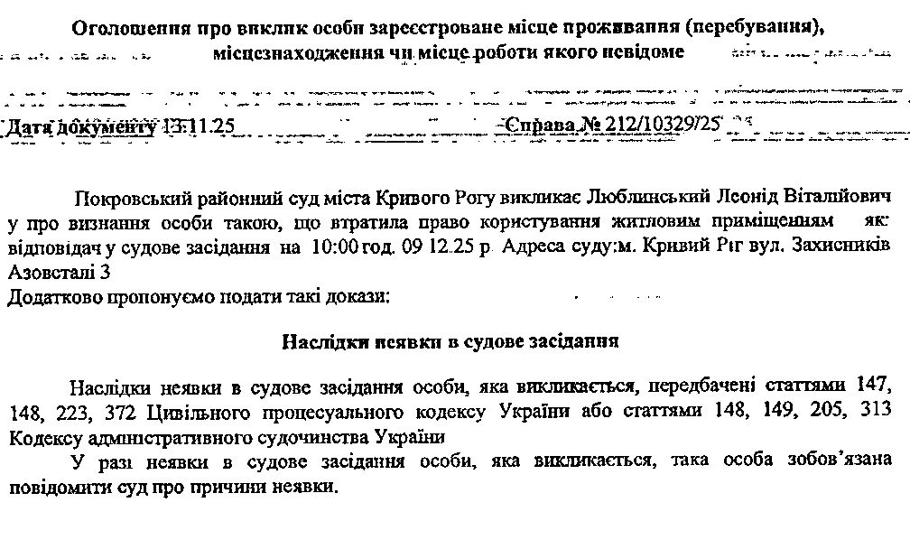Оголошення про виклик до суду Люблинського Леоніда Віталійовича