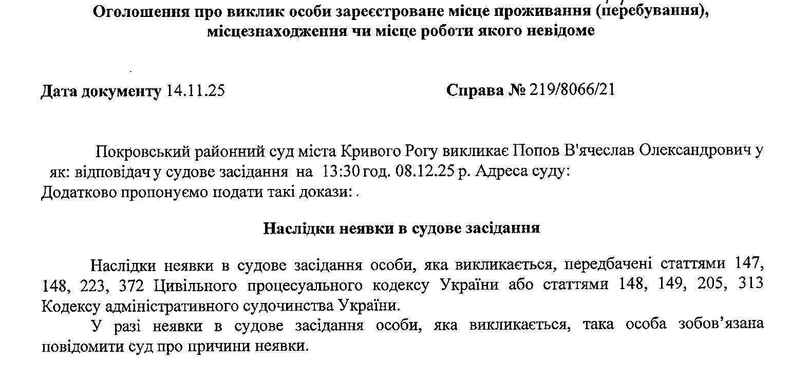 Оголошення про виклик до суду Попова В'ячеслава Олександровича