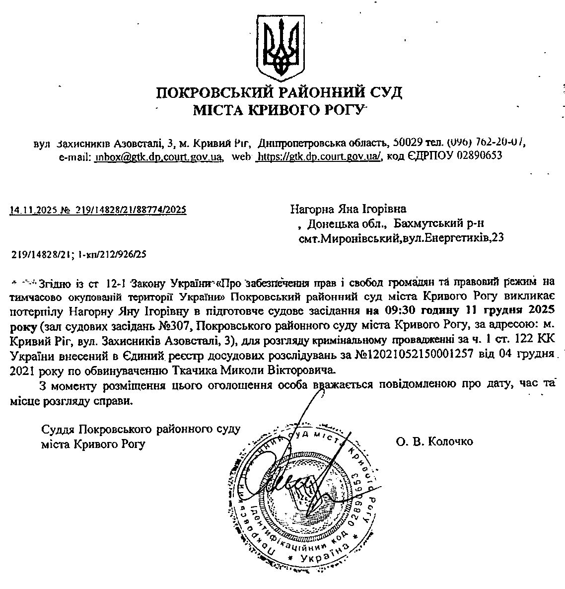Оголошення про виклик до суду Нагорної Яни Ігорівни